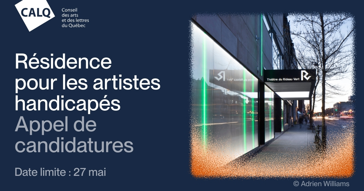 Le Conseil des arts et des lettres du Québec (CALQ) et le Théâtre du Rideau Vert s’associent pour proposer un programme de résidence destiné aux artistes sourds et sourdes ou en situation de handicap (personnes malentendantes, aveugles ou semi-voyantes, de la diversité capacitaire ou neurodivergentes), ainsi qu’aux collectifs intégrant des personnes vivant ces réalités.